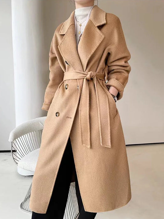 2024 Autumn/Winter New Cashmere Coat Women's Long Double breasted Lace up Water Wave 100% Double sided Wool Women's Coat