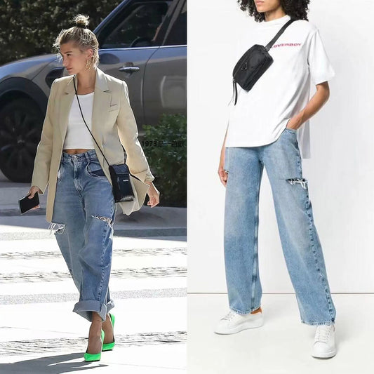 2024 Spring New Retro High Waist Jeans for Women's Casual Straight leg Jeans Korean Edition distressed loose and versatile jeans